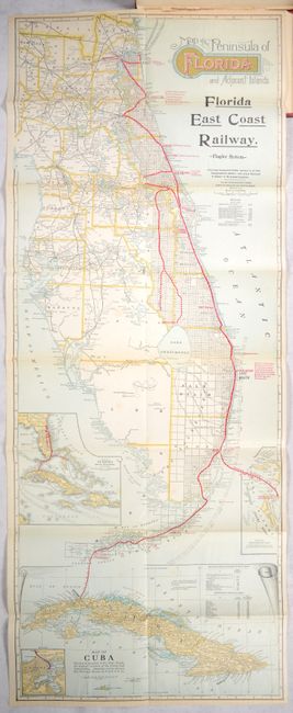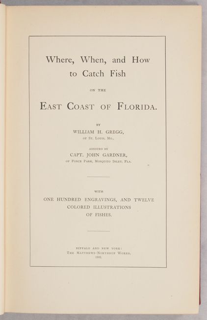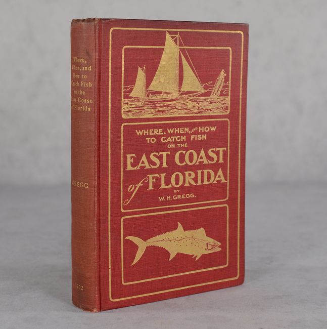 The map is still bound into the rear of Where, When, and How to Catch Fish on the East Coast of Florida by William H. Gregg. The 268-page volume features "one hundred engravings, and twelve colored illustrations of fishes" including Spanish Mackerel, Pompano, Red Snapper, Porkfish, and more. Hardbound in red cloth with gilt title and illustrations on the front cover.