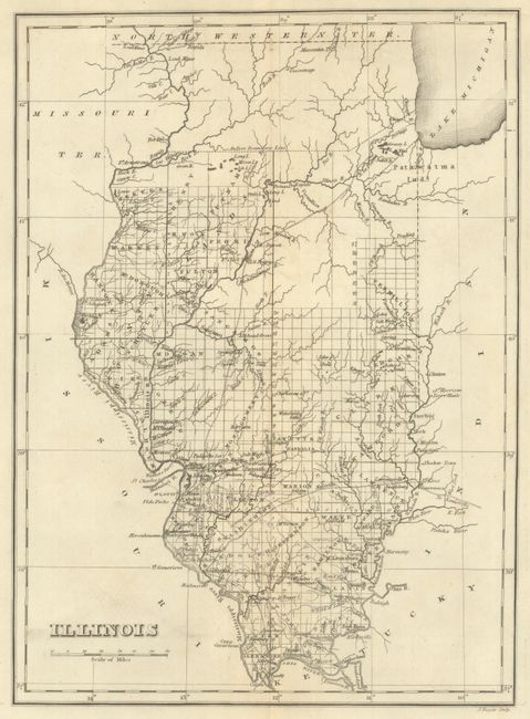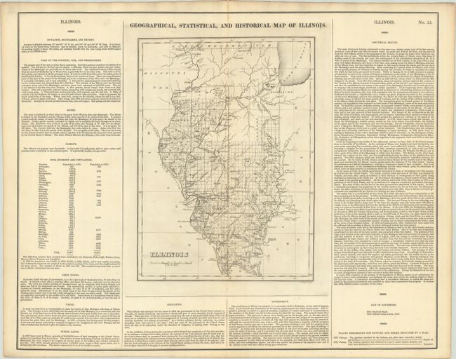 The map is on a full folio sheet (21.9 x 17.5") surrounded by English text giving a brief description of the state's boundaries, rivers, climate, chief towns, public lands, government, and history. The finely engraved map delineates counties and locates major towns, settlements, rivers and creeks. County configuration is current to 1826 with the addition of Vermilion in the east and McDonough in the west. The Indian Boundary line is prominently depicted in the north along with lands belonging to the Potawatomi tribe. Engraved by J. Yeager.