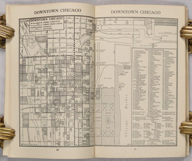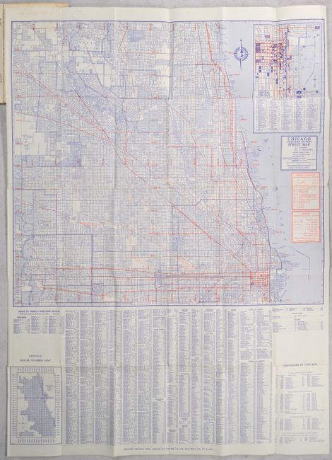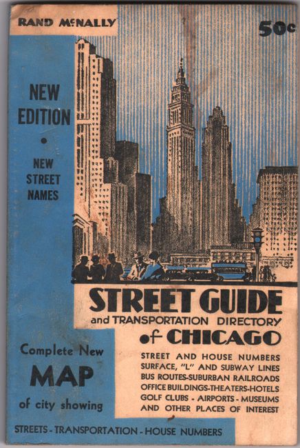 This informative Rand McNally street guide offered a comprehensive overview of the Windy City for just 50 cents. The main attraction is the very detailed double-sided street map tipped in to the back of the guide. The recto depicts the northern part of Chicago, extending from Grant Park north to show suburbs such as Skokie and Evanston. An inset at top right details central Chicago, zeroing in on Grant Park and vicinity, with its own extensive index of buildings and other points of interest. Below the map is a small house number map. On verso is the southern portion of the city, ranging from Lake Calumet north to Douglas Park. The Union Stock Yards and Chicago Midway Airport are prominently shown, along with several other parks, cemeteries, and other notable attractions. Both sides delineate transportation routes, including subway and elevated lines, in red, and include a street index and points of interest. Three smaller maps, showing house numbers, the elevated and subway lines, and downtown Chicago, appear in the text of the guide. The 96-page guide lists streets, transportation, sites of interest, and more, with black & white photographs of the city peppered throughout. Illustrated soft covers (4.7 x 7.1") feature skyscrapers looming over a city scene.