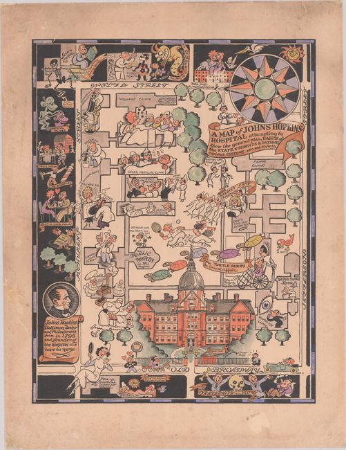 This terrific pictorial map of Johns Hopkins Hospital is credited to Richard Q. Yardley. Yardley honed his irreverent style as the editorial cartoonist at The Baltimore Sun. At the bottom of his map is a view highlighting the architecture of the Billing's Building. The rest of the map provides a tour of the various clinics and wards in the teaching hospital complex and the wacky shenanigans therein. In the Woman's Clinic, a new mother is surprised to find she has birthed quadruplets; a patient comes to in a panic on the surgeon's table, various tools scattered about his bedside; in the general pathology department, a researcher examines some disdainful bug; in the cafeteria, the chef slings hash and more hash. The Turtle Derby, a popular annual fundraising event that ended in 1977, is prominently depicted near center. The border shows vignettes of other locations around campus, including Welch Library, the Public Health School, the Animal House, and Fraternity Row. The map features some unfortunate racial caricatures typical of the period, as well as a dash of sexism in its raunchy treatment of the "beauteous nurses." At bottom left is a respectful portrait of Johns Hopkins. An elaborate compass rose above the banner title orients north to the left.