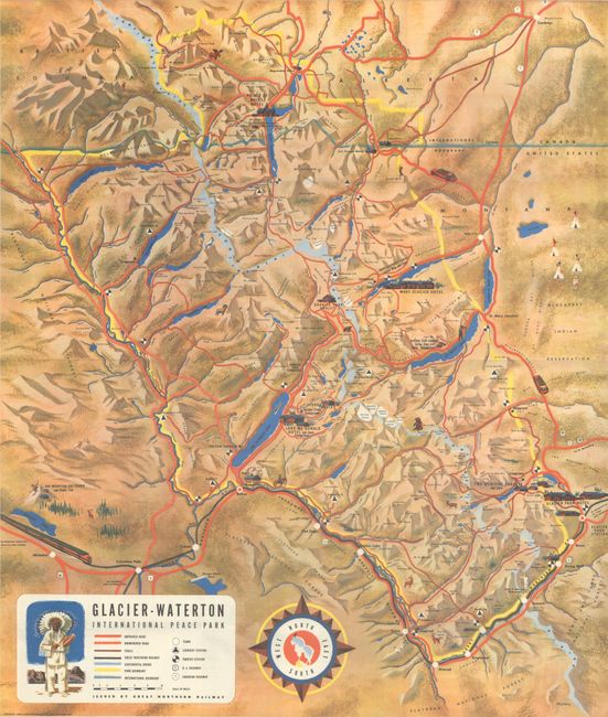 This colorful pictorial map was issued by the Great Northern Railway and touts the region as "the only National Park in the U.S. on the main line of a transcontinental railway." The map covers both Glacier National Park in the U.S. and Waterton Park in Canada, the world's first international park created in 1932. The map locates many popular destinations within the parks including Lake McDonald, the Apgar Building, Going-to-the-Sun Road, and Prince of Wales Hotel to name a few. A legend further identifies improved roads, unimproved roads, trails, the line of the Great Northern Railway, ranger stations, and more. Decorated by a compass rose featuring a mountain goat and signed by "Wessel" at lower right. The verso contains numerous illustrations and an inset of tour maps of Glacier.