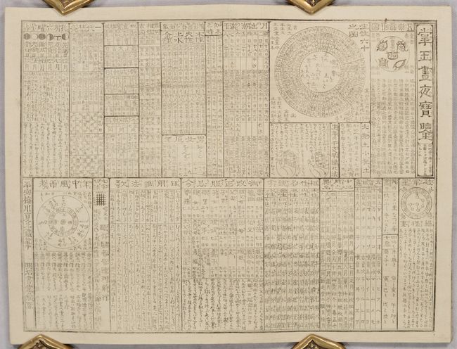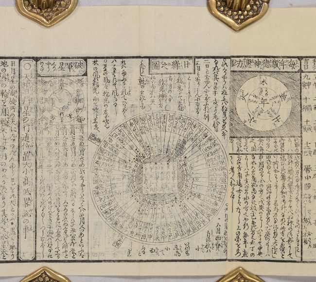 B. [Japanese Almanac] Nenreki, Ansei 3, dated 1856 (123.5 x 5.5"). This almanac includes small, woodblock maps of the world, Japan, and China. There are also circular diagrams that show a traditional eastern calendar and astrological system, the solar system, a star chart, the phases of the moon, and solar and lunar eclipses. The almanac folds accordion-style into stiff paper covers.