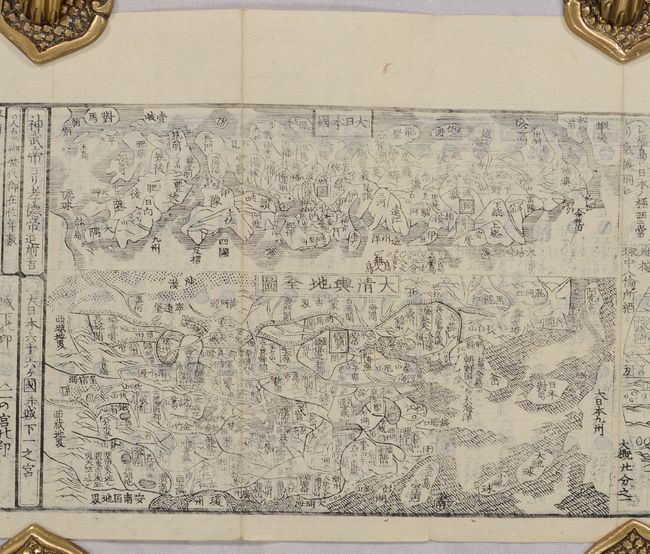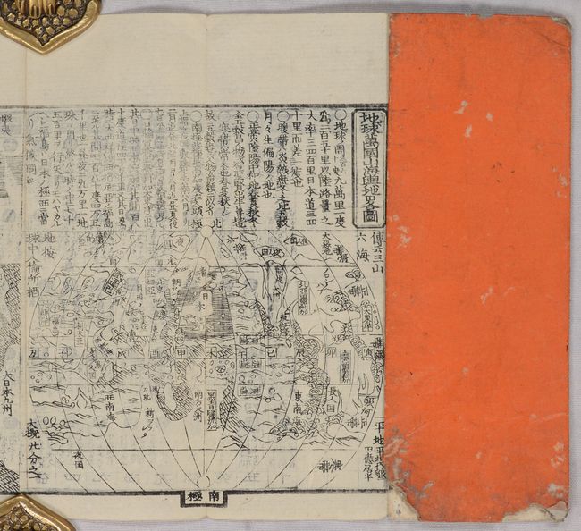 This gazetteer includes two copperplate maps: a double-hemisphere map of the world and a map of Japan. The fact that these maps are copperplate is quite unique as most Japanese printing was done in woodblock at the time. The world map was created by Matsuda Rokuzan and is titled Chikyu Bankoku Zen Zu (9.2 x 5.8") and merges western knowledge with an eastern perspective. Japan is featured at the center of the eastern hemisphere while Europe, the Middle East, and North America are partially obscured. The map of Japan (9.2 x 5.8") omits Hokkaido but has good detail of regions, towns, and more.