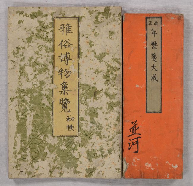 A. [Japanese Gazetteer] Gazoku Hakubutsu Shuran, Kaei 6, dated 1853 (4.8 x 7.2"). This gazetteer was published the year Commodore Perry's expedition arrived in Japan. The Perry Expedition consisted of two American military and diplomatic missions (1852-55) to visit the Tokugawa shogunate with the goal of establishing diplomatic relations and negotiating trade agreements. This government had a strict isolationist policy and few foreign visitors gained entry over its 250-year existence (1603-1868). While Perry’s first visit was limited in success, his second journey (1854-55) assured the diplomatic and trade ties that the U.S. sought. Japan’s opening of its doors eventually led to the fall of the Tokugawa shogunate and the restoration of Emperor Meiji.