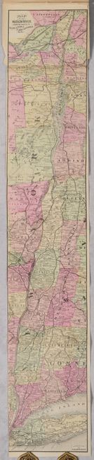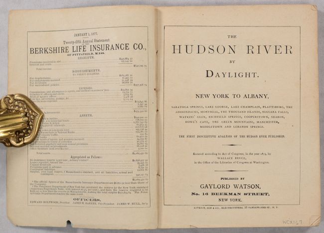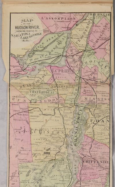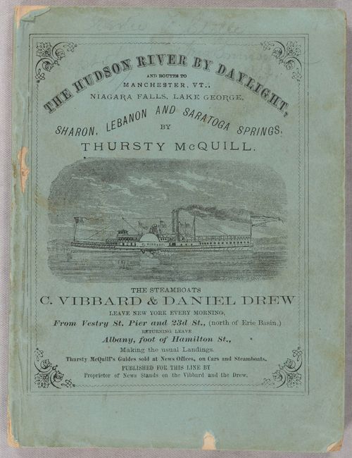 This small strip map extends from New York City to Albany and Montreal including the course of the Hudson River, Lake George, Lake Champlain, and the St. Lawrence River. Along these waterways, roads and railroads are identified along with county boundaries and numerous place names. The map is attached to the rear of the The Hudson River by Daylight guide published by Gaylord Watson (after Wallace Bruce). 169 pages with numerous advertisements. Paper covers feature the steamboats C. Vibbard & Daniel Drew, which made daily trips between New York and Albany.