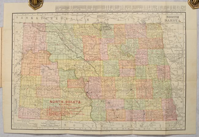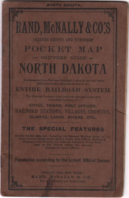 An attractive pocket map issued 20 years after statehood. County configurations are current to 1908 and prior to the creation of Mountrail County in 1909. The various railroads in the state are numbered in red overprinting which correspond to a table at lower left naming 7 railroads including the Chicago, Milwaukee & St. Paul, Great Northern, and Northern Pacific. Drawn on a scale of 21 miles per inch. Includes a 19-page index and several pages of advertisements. Folds into brown paper wrappers entitled "Rand, McNally & Co.'s Indexed County and Township Pocket Map and Shippers' Guide of North Dakota."
