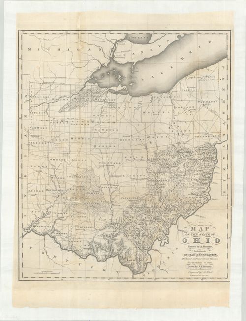 This scarce map resulted from the combined efforts of Alexander Bourne and John Kilbourne, both active surveyors in the early mapping of Ohio. It depicts 70 counties, including the recently organized counties in the northwest corner of the state. It also provides excellent topography, roads, towns, and forts, with particular attention to Indian Reservations. At the top of the state is the disputed boundary with Michigan before the outbreak of the bloodless Toledo War of 1835 and 1836. That conflict occurred over a sliver of land called the Toledo Strip, a 468 square mile stretch of land that both Ohio and Michigan territory claimed as their own. They actually both raised militias and threatened each other from the banks of the Maumee River, but nothing more severe than taunting ensued. Michigan acquiesced to Ohio's border demands in order to be admitted to the Union in 1837, gaining the Upper Peninsula as a consolation prize. Issued in Caleb Atwater's Description of the Antiquities Discovered in the State of Ohio and Other Western States and in Transactions and Collections of the Archeologia Americana by the American Antiquarian Society.