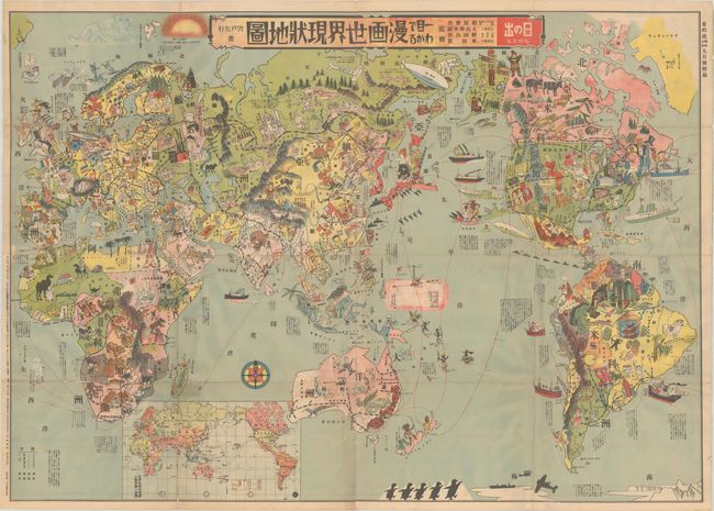 This fascinating and rare satirical map was published as a supplement to a popular Japanese monthly magazine, Hi no De, which translates as "sunrise." The cartoon ("manga") illustrations were made by Sako (or Sagyo) Shishido and clearly depict the hostile relations between countries (particularly between Japan and the U.S.) and the impending war. Dozens of caricatures of famous figures are shown throughout, including: Herbert Hoover, Al Capone, Babe Ruth, and Jack Dempsey in the United States; Chiang Kai-shek and Chang Hsueh-liang in China; Stalin in Russia; Mussolini in Italy; Hitler and Hindenburg in Germany; Ramsay MacDonald in Britain; Ghandi in India; and many more. The map is also filled with references to war, including war ships, planes and zeppelins, cannons, and factories, with Saint Basil's Cathedral in Russia turned into a factory.