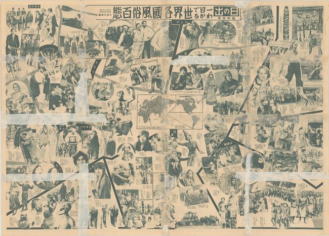 This map was published in 1932, or Showa 7, at a time when Japan had renewed imperial ambitions yet political problems internally. This map clearly illustrates to a Japanese audience the assets and liabilities in each country around the world, with notations (in Japanese) throughout. On verso is a collage of photographs divided into various regions around the world, as illustrated by the small world map at center. These photos demonstrate the culture, lifestyle, and costumes of the people in each region. Within the photos of North America are images of dancer and singer Josephine Baker, a Boy Scout kneeling with an American flag, and women in swimsuits holding a sign stating "Notice to Bathers," which were used to protest the restrictions on antiquated dress codes for bathing.