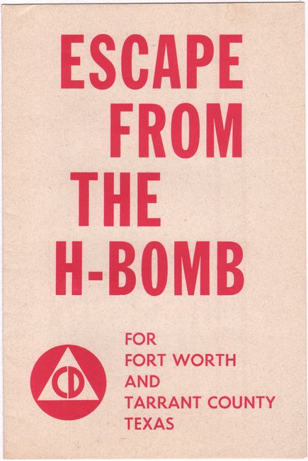 This Cold War-era map was published by the Office of Civil Defense (1961-64), advising the public on what to do in the event of a hydrogen bomb attack by the Soviet Union. It was likely issued around the time of the Cuban Missile Crisis, when the threat of nuclear war was at its height. The brochure advises the reader that "the 'duck and cover' scheme is no longer safe - you must get away." It elaborates that in the event of an evacuation signal, one must take the most take direct route out of the danger zone using the supplied map, following the one-way routes out of town. In addition to calm, patience, and a survival kit, "the more distance you can put between you and downtown Seventh and Main at the critical time, the better your chance of survival." Fortunately, Fort Worth's geographic location guaranteed at least a two-hour warning window before any bomb could reach the city.