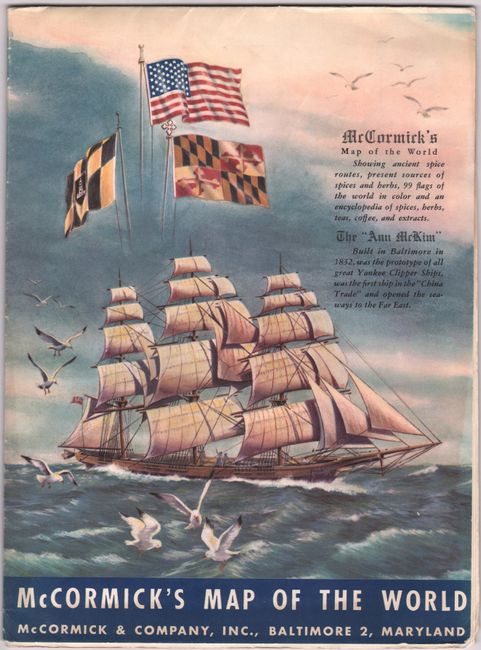 This promotional double-hemispheric map of the world was created by McCormick & Company in Baltimore, Maryland. It shows the "ancient spice routes, present sources of spices and herbs, 99 flags of the world in color and an encyclopedia of spices, herbs, teas coffee, and extracts." The map is a wonderful blend of history and promotion and features both illustrations and the tracks of notable explorers including Columbus, Vasco da Gama, Drake, and Magellan. Of particular importance to McCormick, the map also names and locates spices found throughout the world, with a large percentage originating in Asia. The corners of the map further emphasize McCormick's trade with illustrations showing the harvesting of various beans, teas, and spices. The map is surrounded by national flags, and three McCormick Schilling headquarters are pictured in the cusp at bottom. The map is further embellished by classical decorative elements including wind heads, sailing ships, a compass rose, and the signs of the zodiac. The verso contains "McCormick's Encyclopedia of Flavoring Extracts - Spices - Teas- Coffees" and company information. Self-folds into pictorial wrappers (8.7 x 11.6").