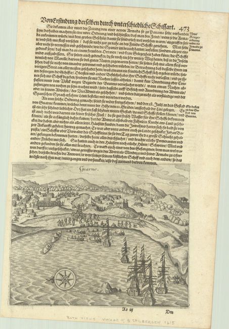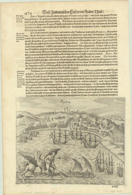 This sheet features two striking engravings that originally appeared as Plates XI and XII in Part XI of de Bry's Grands Voyages. They were republished in Johann Ludwig Gottfried's Newe Welt und Americanische Historien, a collection of voyages. Also known as Historia Antipodum, Gottfried's work is an abridgement of de Bry's voyages to America that incorporates much new material. Matthaus Merian, de Bry's son-in-law and publisher for Historia Antipodum, was granted access to de Bry's copper-engraved plates. The engraving on recto depicts Dutch naval officer Joris van Spilbergen's arrival in the Peruvian coastal town of Huarmey. The expedition is shown attempting to replenish their stocks and investigate a castle; Spanish horsemen ride off to report their landing. The engraving on verso documents a Dutch fleet attacking a Spanish stronghold in the important port city of Paita. In August 1615, Spilbergen reached the port of Paita, anchored his ships offshore, and led 300 men onshore to attack the Spaniards. The Spanish soon gave up and retreated. In the foreground is a large bird representing an Andean condor, believed to have been caught by the Dutch on the nearby island of Lobos de Tierra. On a sheet of German text measuring 9.1 x 13.6".