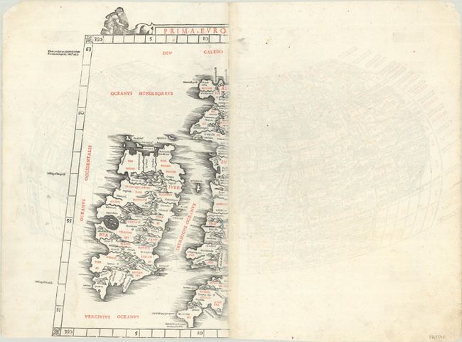 The 1511 edition of Ptolemy's Geographia included 28 woodcut maps, each printed from two separate blocks. With the exception of the two world maps, they were printed in such a way that the left-hand side of each map was printed on the verso of the right-hand side of the preceding map. Thus the complete maps from this atlas that are sold on today's market are now joined from two sheets, with unrelated half maps on the verso. On verso of this map is a partial map of the British Isles.