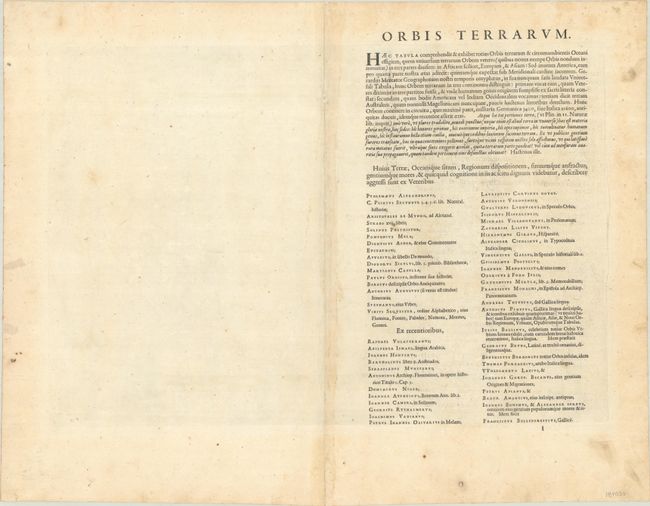 This is the first (of three) world maps that was included in Ortelius' famous atlas. It is a simplified reduction of Mercator's influential map of 1569 presented on an oval projection rather than the projection for which Mercator is now famous. From surviving correspondence, it is known that Mercator encouraged Ortelius and provided him with information, particularly with coordinates of places in the Americas. Placed on a cloud background, the map shows North America as much too wide and South America retains the unusual bulged southwestern coastline. At the poles, a prominent Northwest Passage snakes its way south of the four islands making up the arctic regions, and a huge Terra Australis Nondum Cognita makes up the imaginary southern continent. A notation next to New Guinea notes that it is unknown if this large island is a part of the southern continent. The title is in a strapwork banner at top, which is balanced with a quotation from Cicero at bottom. This superb map was engraved by Frans Hogenberg with his signature at bottom. The plate was used for the first 16 editions of the Theatrum. A crack developed in the lower left corner from 1570 onward. This example shows evidence of the crack. This is the fourth state, with Latin text on verso.
