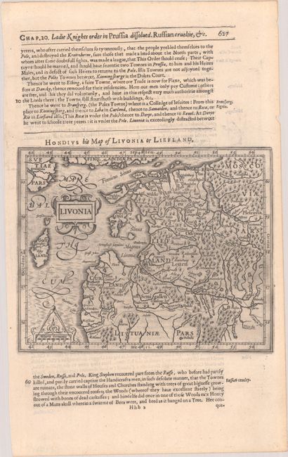 This beautiful map covers present-day Estonia, Latvia, and part of Lithuania. Fully engraved to illustrate the forests, cities, and villages and embellished with a strapwork title cartouche and a scale of miles. On a full sheet of English text measuring 8.1 x 13.3".