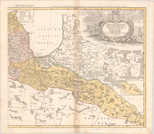 This large map on two sheets covers much of present-day Latvia in fine detail, extending to show part of northern Lithuania as well. It centers on Riga and spans from Libau (Liepaja) and Memel (Klaipeda) on the Baltic coast east to part of Livonia and Duhnaburg (Daugavpils). Political divisions, towns and cities, rivers, lakes, and forests are located. A small inset on the eastern sheet shows more of the Duchy of Semigallia. A key identifies various types of towns and cities and a Sunday prayer in the now-extinct Curonian language appears at bottom left. The title cartouche on the eastern sheet includes a coat of arms for the Duchy of Courland and Semigallia, a fisherman, a dense wood, and a bear attacking a deer. The cartouche on the western sheet features two figures in local dress. Cartography is credited to Johann Christoph Barnickel. Each sheet has an alternate French title above the neatline: Le Duche de Courlande... (western sheet) and Le Duche de Semgalle... (eastern sheet). The western sheet measures 13.9 x 19.3"; the eastern sheet measures 21.8 x 19.1".