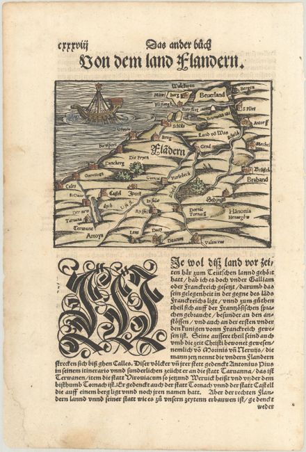 Beautiful woodblock map of the region of Flanders filled with mountains, rivers, forests and towns. The map extends from Middelburg, the Netherlands to Calais, France, and as far east as Antwerp and Brussels. A Viking longboat sails the sea. On verso is an image of King Dagobert attempting to Christianize the people of Flanders. On a sheet of German text measuring 8.5 x 12.5".