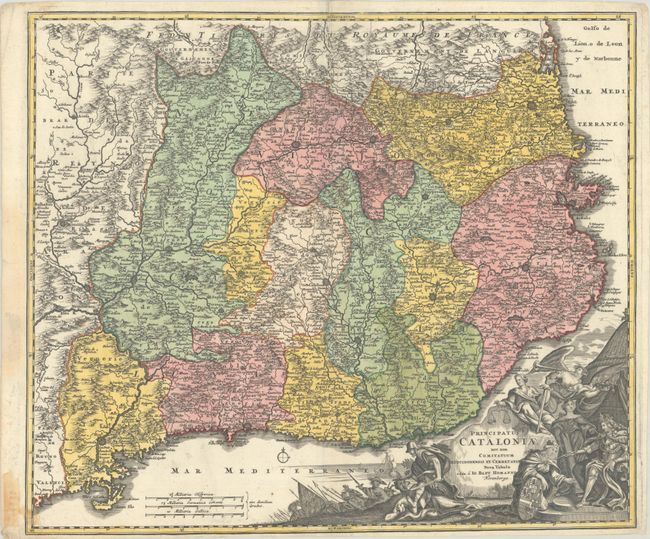 Decorative map of the Spanish region of Catalonia that covers the Mediterranean coastline from the French border via Barcelona to Tortosa. The splendid, allegorical cartouche at right shows Perseus about to decapitate the fearsome Medusa, and a figure representing Catalonia is kneeling before a monarch, to illustrate the surrender of Catalonia to Felipe V of Spain during the War of the Spanish Succession.
