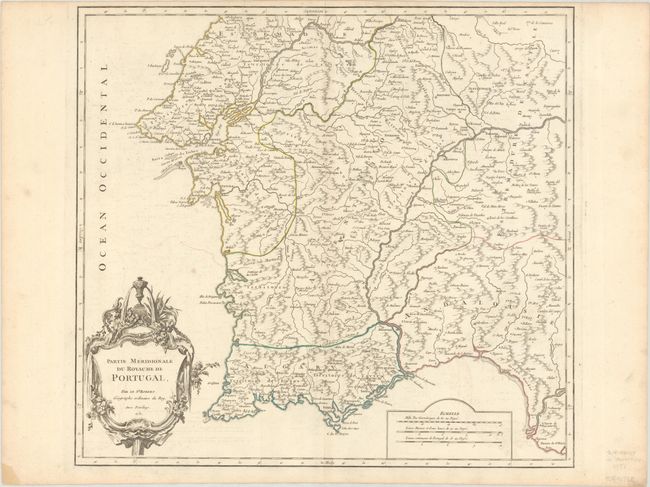 A handsome, matched pair of large maps which together cover the whole of Portugal. They are filled with engraved detail of topography and cities with the fortifications at Lisbon prominently shown. The northern portion details the area from the Mino River south to the coastal town of Peniche, near the Berlengas Islands. The southern portion starts with the province of Estremadura, down the coast to Lisbon and ending with Cape St. Vincent and Cape de St. Marie. Each map stands on its own and is graced with an elegantly designed title cartouche and scale of miles.