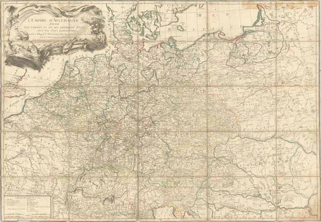 This large wall-sized map of the German Empire extends from the Baltic Sea to the Gulf of Venice, and from France to Romania. The map focuses on fortified cities, ports, and postal routes and is densely engraved with political boundaries, topography, and hundreds of tiny towns. A large title cartouche fills the North Sea and is adorned with a soldier and the German eagle. This map was printed on two sheets and joined, and then dissected and backed in linen.