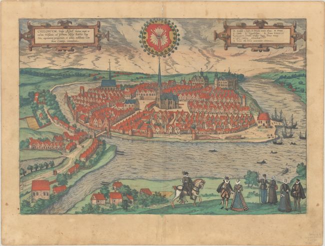 A lovely bird's-eye view of the port city of Kiel on Germany’s Baltic Sea coast. The city is centered on the Gothic church of St. Nicholas, while the church of the Holy Spirit is at left. Costumed figures fill the foreground while the sky is filled with two cartouches and a coat of arms. Latin text on verso.