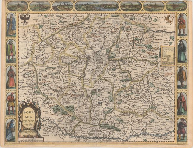 This lovely copper engraved carte-a-figures map covers the heart of the present-day Czech Republic, the ancient kingdom of Bohemia. Seventeen engraved vignettes parade at top and sides, presenting views of Prague, the Emperor’s Court, and principal cities of Czalsa, Comethau, Polm, Schlani & Laun. The side borders illustrate five different levels of Bohemian society from King and Queen to countryman and countrywoman, all in fabulous costume. This is an early edition with the imprint of George Humble in Popshead Alley in the title cartouche, published between 1627-32. English text on verso.