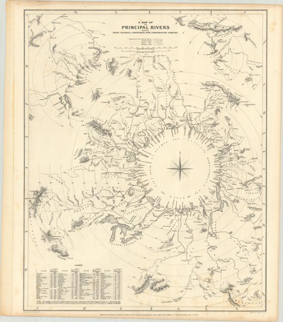 A very attractive and interesting comparative thematic chart uniquely arranged on concentric circles around a classic compass rose. The rivers are depicted with their relative distance from the sea, including an index of each river’s length in English miles. Associated towns and lakes are noted and respective countries are identified in capital letters keyed with an index at lower left. Two smaller, partial concentric circles located in the upper corners show additional rivers in the same fashion. This is a fine thematic map that utilizes a unique method to graphically compare the rivers of the world. Published in London by Baldwin & Cradock.