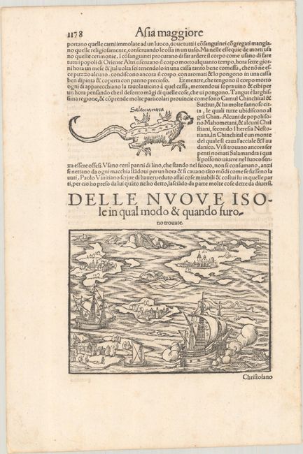 This very early, rather imaginative map of the West Indies refers to Christopher Columbus' exploration of the islands and subsequent discovery of America in 1492. It is one of the earliest maps of the region available to collectors and a foundation map for a collection focused on the Caribbean. Each island is unnamed and includes at least one large city, while sea monsters and various types of ships fill the surrounding seas. This engraving appears twice in the Cosmographia: first in the opening pages to illustrate the concept of an island, and then towards the end to represent islands in the New World. On a sheet of Italian text measuring 8.5 x 12.8", published between 1558-75. This example is accompanied by an additional sheet of text covering Columbus' voyage.
