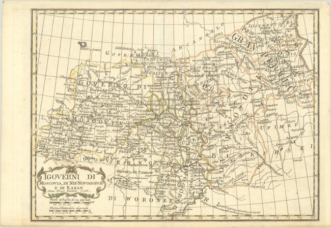 This pair of elegantly engraved Italian maps appeared in Bartolomeo Borghi's Atlante Geografico. The first map centers on the Archangelgorod Governorate. It covers from St. Petersburg and Lake Ladoga east to the border with Siberia, extending north to show part of Novaya Zemlya. The second map focuses on the governorates of Moscow, Novogorod, and Kazan. Both maps include fine details of towns and cities, political divisions, and watershed. They are decorated with decorative title cartouches. Engraving on the first map is credited to Giovanni Silvestrini; no engraver is credited on the second.