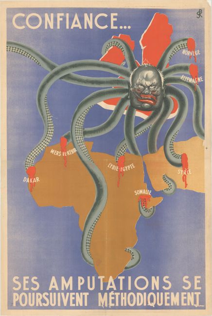 This striking, anti-British propaganda map was published to give support to Vichy French forces and turn the French public against Britain. The design focuses on a 12-tentacled octopus bearing a grotesque version of Winston Churchill's face, holding a cigar between his blood-red lips. The tentacles reach out to seize French colonial possessions and Axis territories, with bloody, severed tentacles signifying sites where Britain had faced defeats in the early years of the war. These defeats included Operation Menace in Dakar, Operation Catapult in Mers-el-Kébir, and Britain's campaigns in Norway. The title translates as: "Have confidence... the amputations are continuing methodically." This was intended to reassure pro-Vichy supporters that not only had Britain already been defeated in multiple instances, but would continue to be defeated by the Axis powers. However, the map is not entirely forthcoming, as the situation in Syria was actually a British success due to its Syria-Lebanon Campaign in 1941, so that severed tentacle was misleading.