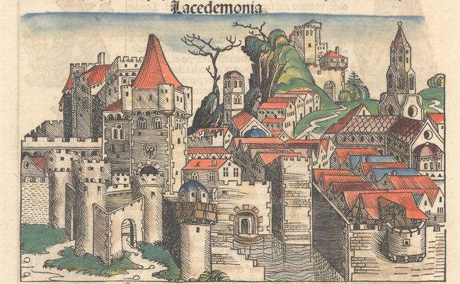 Hartmann Schedel's Nuremberg Chronicle (Liber Chronicarum) was published in two editions, Latin and German, both in 1493, appearing in print just before Christopher Columbus' discoveries completely re-shaped the European view of the World. This splendid work presented the history of the world in a pictorial encyclopedia with approximately 285 pages of text and 1,800 woodcut illustrations. Among these illustrations are views of towns and cities throughout Europe and the Near East. The majority of these views are entirely imaginary. In fact, 49 of the views are actually printed from the same group of 14 woodblocks. There are also 30 double-page views of cities with more realistic images. In addition to the topographical images, there are an enormous number of other subjects, including diagrams of the Creation, comets, family trees, portraits & biblical scenes. The text was compiled and edited by Hartmann Schedel, printed by Anton Koberger, with illustrations designed by Michael Wohlgemuth and Willem Pleydenwurff, who cut the woodblocks, probably with the assistance of their apprentice, Albrecht Durer.