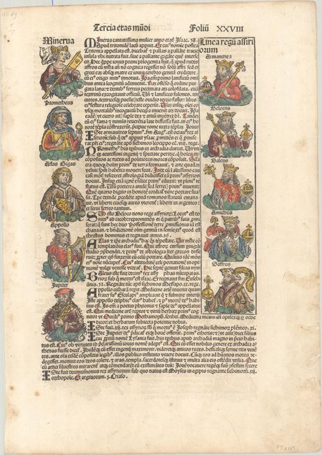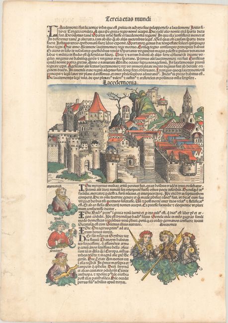 This excellent engraving of Lacedaemonia or Sparta is embedded in text covering the history of Greece. Below the view are portraits of three Greek gods including Mercury and three Amazones or armed women warriors. On recto there are two columns of portraits representing the line of Greek gods from Minerva to Jupiter and the line of five Assyrian kings from Armanitres to Saffrus. Sheet of Latin text measures 11.3 x 16.1".