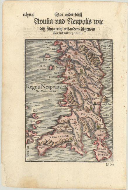 Woodblock map of Naples with mountains and rivers prominently featured and a moiré pattern in the sea. Only a few place names mark the major cities. German text on verso.