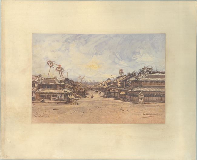 This gorgeous chromolithograph of Yokohama, Japan was published in Berlin by R. Wagner. It presents a man walking down a city street with buildings on either side. The chromolithograph is based on a watercolor by German artist Eduard Hildebrandt (1818-68). Hildebrandt took a trip around the world from 1860 to 1862 and chronicled his adventures with a series of stunning watercolors. Wagner published a collection of these as chromolithographs in 1864. The originals were exhibited a few years later at London's Crystal Palace. Mounted on a backing board, as issued, with publisher's imprint on verso.