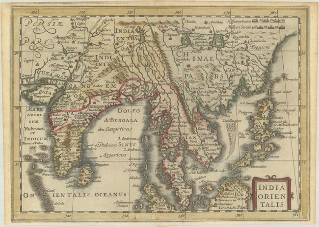 This is a reduced version of Jodocus Hondius' folio map of South East Asia. It covers the region from India through southern China and the Philippines including all of the Malay peninsula with parts of northern Sumatra and Borneo. The Gulf of Cambay is very exaggerated. The mythical Caiemai Lacus appears northeast of India, along with two large lakes in China. Blank verso.
