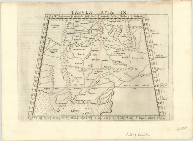 This Ptolemaic map covers most of present-day Iran, Afghanistan, and Pakistan, with a graphic depiction of the delta of the Indus River. Mountain ranges divide the regions and the major cities are shown. Latin text on verso.