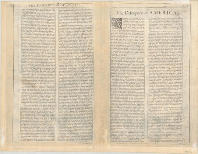This English map of the Americas is the earliest folio atlas map to depict California as an island, thus propagating one of the most enduring cartographic myths. It is also significant for its accurate depiction of the coast between Chesapeake and Cape Cod, and early portrayal of the English colonies, Iames Citti (Jamestown) and Plymouth. Boston and Long Island are not shown. The spurious islands of Brasil and Frisland still appear in the Atlantic. An inset map shows Greenland and Iceland. The map is the superb workmanship of the Dutch engraver, Abraham Goos. It is decorated in the popular carte-a-figures style with panels of costumed native figures at each side and vignettes of major cities at top. The figures at left represent the native people of North America, and at right the major South American tribes. The cities illustrated include Havana, Mexico City, Rio de Janeiro, Cusco, and other important South American settlements. A number of sea monsters, flying fish and sailing ships also decorate the map. Dated in the cartouche 1626, published circa 1676 with the imprint of Basset and Chiswell in the cartouche below the title. English text on verso.