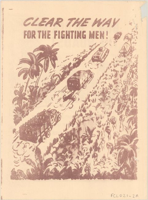 This well-preserved leaflet coded "11-F-6" was produced by the Psychological Warfare Branch of the U.S. Army. It was dropped by U.S. forces in the Philippines and intended for local civilians. The illustration on the front of the leaflet shows an army convoy encountering a crowded street with locals fleeing a city. Text encourages the readers "if you must leave your towns go across country or over trails." On verso is a cleared road "for the fighting men!"