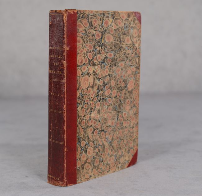 This is the first volume of The Journal of Health, the earliest serial publication related to personal health in the United States, containing 24 bi-weekly issues for the period September 1829 - August 1830. It features an early lithograph frontispiece promoting the value of exercise with quotation "By various sports, o'er hills, through vallies &c, by rivers' brink, Is life both sweeten'd & prolong'd." At center is a young man holding a curved stick and ball similar to an early golf club and ball. While European prints of golf date back to the 17th century (including its Dutch predecessor kolf), illustrations published in the United States are very scarce prior to the mid-19th century. This image is therefore one of the earliest American depictions of a golf-type game. Lithographed by Childs. Hardbound in quarter-calf with tips over marbled boards and gilt title on the spine.