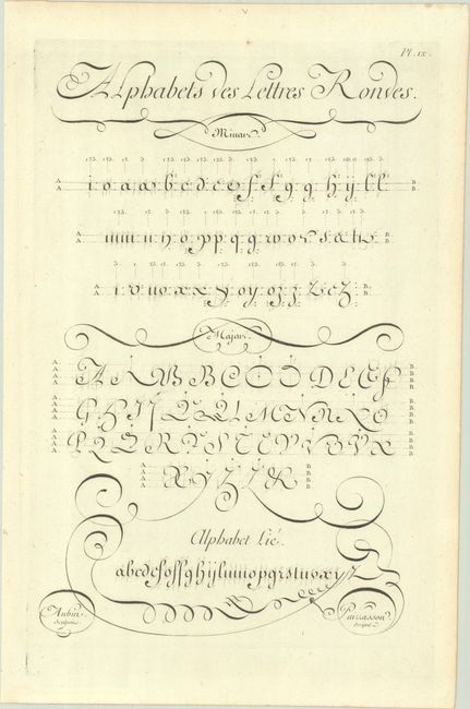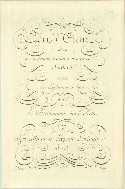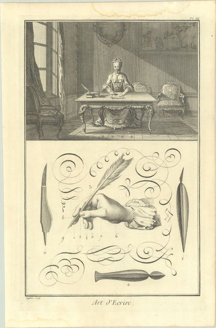 Great complete set of 16 pages of text and 16 plates from this enormously influential work. The plates form a series of illustrations on the art of writing, including illustrations of pens, inkwells, proper posture, preparation of the quill, and the variations and type of letters. Due to problems of censorship, the first edition was issued over a period of 21 years, in an original printing of approximately 4,000 copies.