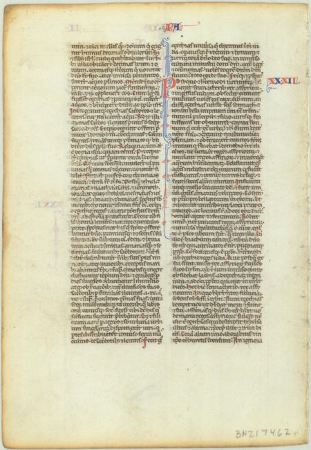 Fine vellum leaf from a French Bible. In Paris, the birth of the Bible as we know it took place around 1200, when for the first time it was bound into a single volume; the order and names of the books were standardized and the text was divided up into numbered chapters. The scribes employed headings at the top of each page and used blue and red initials to mark the beginning of each chapter - such as on this sheet with "LIP" at the top of the page on recto and "PA" on verso, which together form "Palip," an abbreviation for Paralipomenon II, more commonly knows as 2 Chronicles. The text of this leaf is written in a very regular gothic hand, in two columns, 50 lines, with pen work in red and blue. This leaf includes chapters 30-32, which focuses on Hezekiah, the celebration of the Passover, and defending Jerusalem against an Assyrian siege.