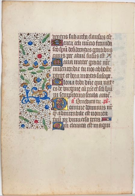 Superb vellum leaf from a French Book of Hours. The text is in a bold gothic book hand with nine illuminated initials and five line fillers. Both sides include fine floral and vine panels painted in a multitude of colors and gold leaf. The text includes a hymn and beginning with the capital "Q" at top on recto translates as: