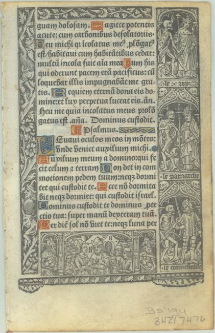 Unusual vellum leaf printed in Gothic textura type with illuminated capitals in red, blue and burnished gold leaf. The text is in Latin and is surrounded by elaborate iron engravings that include plants, animals and mythical creatures. Six of the engravings are allegories from the Dance of Death, depicting a skeleton with important figures, including a king, a Patriarch, an Archbishop, and a knight. Printed vellum Book of Hours leaves are very scarce, as they were only produced between 1496 and 1530. Beginning with the large "L" on recto is Psalm 120, which translates in part as: