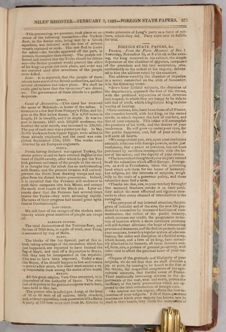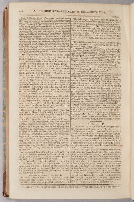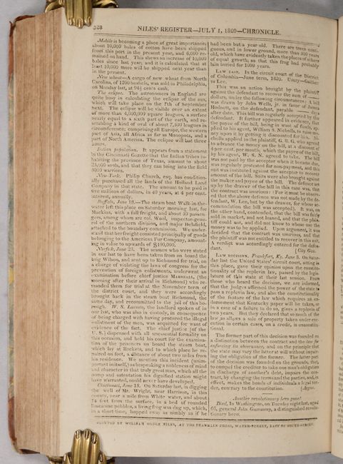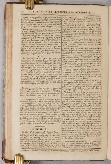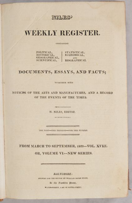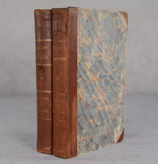 This lot includes two volumes of the Niles' Weekly Register which feature a series of reports on the Mexican Revolution and the expeditions under Gen. James Long to establish an independent Texas. In the first volume, the June 17 issue notes that 53 persons intent on “making an irruption into the province of Texas” by joining Gen. Long’s second attempt for Texas independence were captured and brought to New Orleans. However, only four were formally charged. A force led by Gen. Long, a surgeon and veteran of the War of 1812, had declared Texas’ independence and occupied Nacogdoches for about four months in 1819. Another article notes that the Indian tribes in Texas can muster 5,000 warriors. The second volume includes numerous articles describing the progress of the Mexican Revolution as it reached its culmination. One article reports that Gen. Long and his force easily took La Bahia but then were repulsed, captured and sent to Santillo for trial. Other articles describe the lawlessness in Texas, which had become a haven for bands of robbers and smugglers. 464 pages (volume 1), 416 pages (volume 2). Hardbound in contemporary quarter leather with tips and gilt titles on the spines.