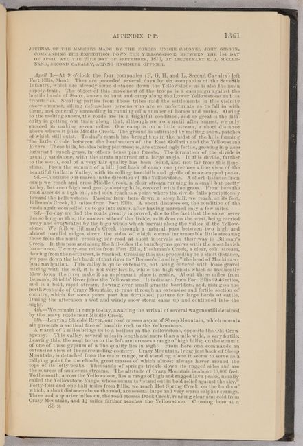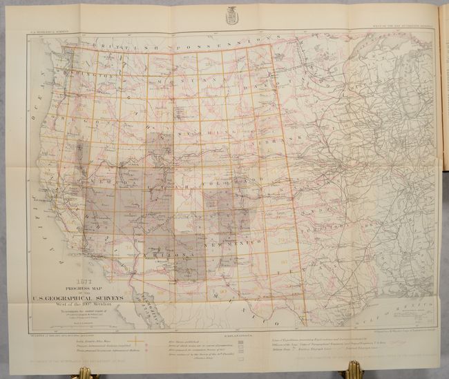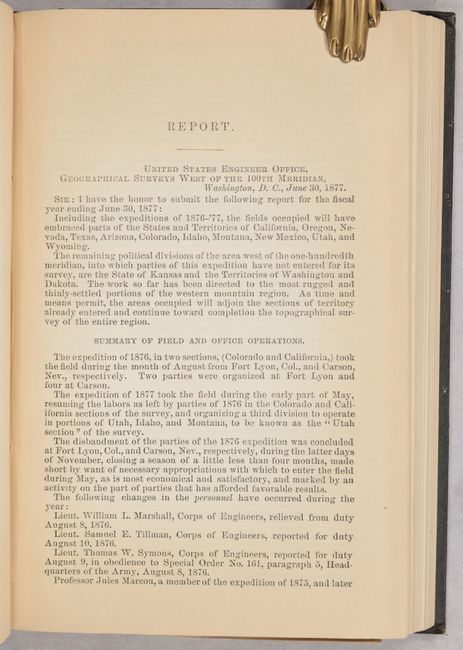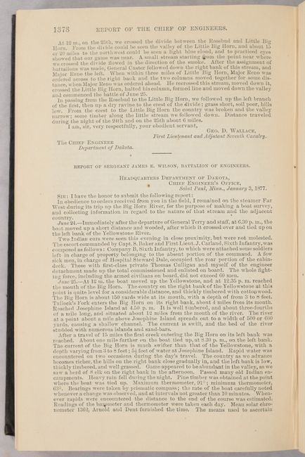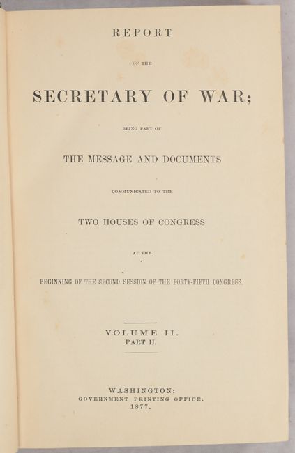 This volume features Lieutenant Edward Maguire's 44-page report and appendices (Appendix PP, pp. 1337-1380) including many details on the Custer battle and its aftermath from first hand reports of officers in the various units. Includes Lt. M’Clernand’s “Journal of the Marches Made by the Forces under Colonel John Gibbon…” and short reports from both Wallace and Wilson. Beyond Maguire's report, the 619-page volume includes numerous other reports, maps and other plates, notably Wheeler’s Annual Report (Appendix NN) and his Progress Map of the U. S. Geographical Surveys West of the 100th Meridian (22.3 x 16.2"). Hardbound in brown cloth with gilt title on the spine.