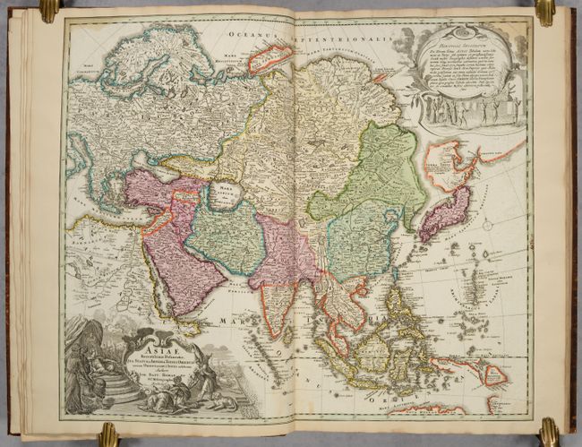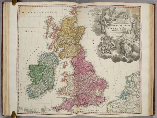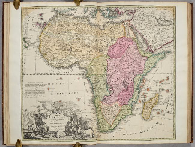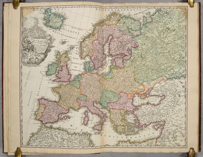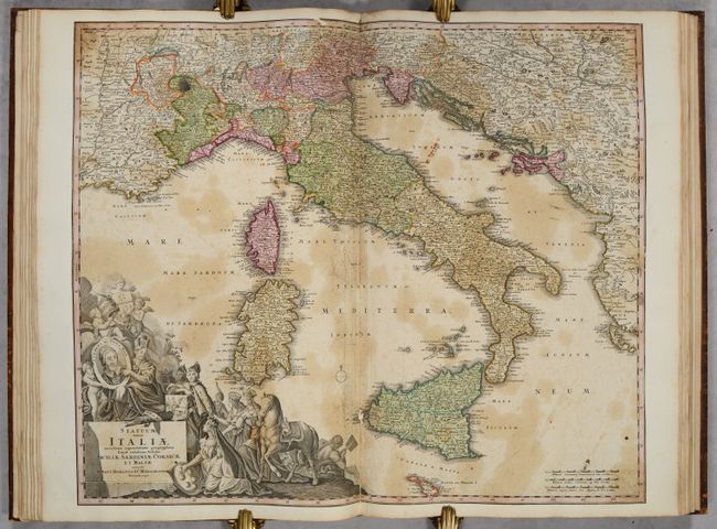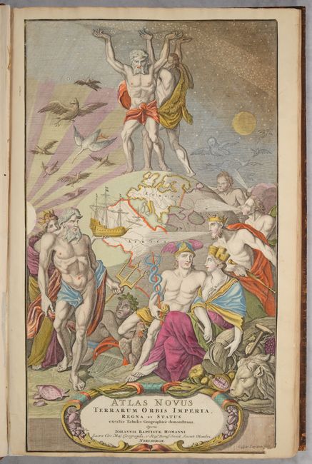 The atlas contains two title pages including an elegantly engraved Atlas Novus Terrarum Orbis Imperia..., which features Atlas and Hercules holding up the heavens while allegorical figures gather in front of a large globe. In the entry on Huebner, Tooley notes that this atlas was published circa 1715. Phillips references an edition with 32 maps published circa 1732. Rebacked with contemporary full leather boards and gilt title on the front cover.