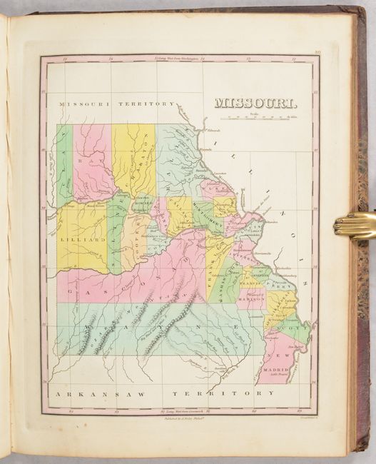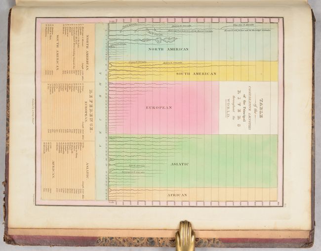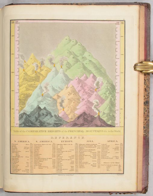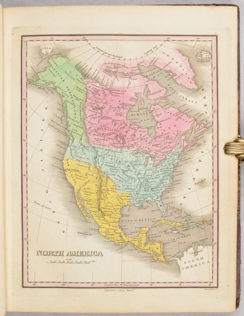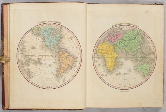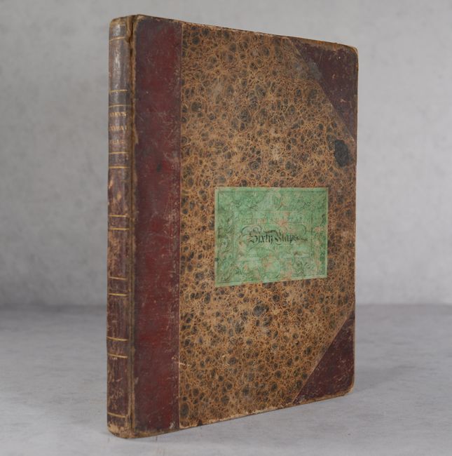 Also of interest is the map of the eastern United States which depicts large Missouri, Arkansas, and North West territories. At the back of the atlas are the thematic charts "Comparative Heights of the Principal Mountains" and "Comparative Lengths of the Principal Rivers." All maps were engraved by Young & Delleker and the ornate title page was lettered by Joseph Perkins. Title page, 58 maps, and 2 thematic charts. Table of contents page is missing. Hardbound in original quarter maroon leather with tips over marbled boards with a printed title label on front cover and gilt bands and titling on spine.