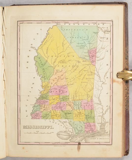 The maps are almost entirely very good to near fine with an occasional spot of foxing in the image and minor soiling in the margins. The double-page maps of New York and Pennsylvania are good (B) with light offsetting and 4" (NY) and 2" (PA) centerfold separations at bottom. The map of Mississippi has some minor staining along the bottom border. Text block is cracked in one place but still fully intact. Endpapers have previous owner signatures and a few manuscript drawings. Binding is in typical condition for this atlas with soiling, some scuffs/abrasions and wear.