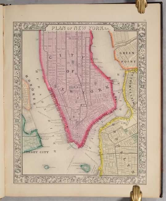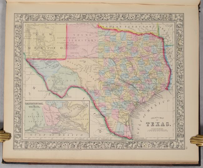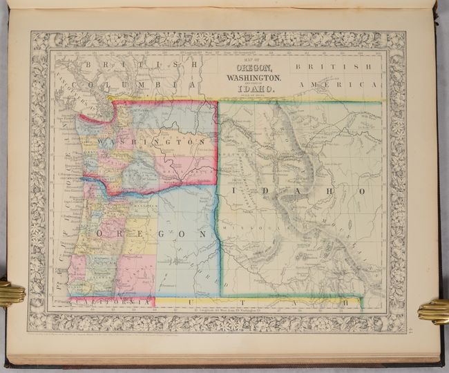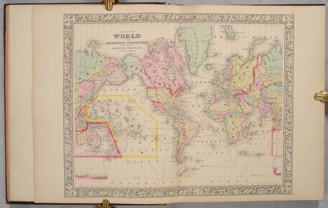 This is a nice example of Mitchell's world atlas produced during the Civil War. It is complete with 84 maps and plans on 53 sheets, each surrounded by Mitchell's signature floral border (the pagination is slightly different from the list of maps). There are 28 map sheets related to the United States including 38 individual states and territories, regions and city plans. There are two world maps - one hemispheric and the other drawn on Mercator's Projection.