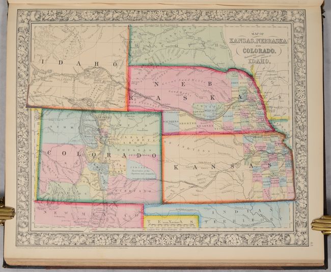 The map of Texas shows county development to 100° longitude with the large regions of El Paso, Presidio and the Bexar Territory further west. The Staked Plain is now called Young Territory. The Map of Kansas, Nebraska and Colorado locates the Gold Region surrounding Denver City. The map of the Northwest shows Idaho still attached to Washington Territory, resulting in an odd-looking inverted-L shape. The Pony Express route is delineated on the map of the United States as are numerous routes of exploration, important trails including the Santa Fe, numerous wagon roads, the Overland Mail Route to California, and early railroads. This 1863 edition did not include the separate map of Arizona and New Mexico, however on the U.S. map the southern tip of Nevada is contained as part of the New Mexico Territory and Utah encroaches a full degree into Nevada. Arizona occupies the southern portion of New Mexico Territory, suggesting a Confederate Territory of Arizona. The atlas also includes full-page plans of the cities of Boston, New York, Philadelphia, Baltimore, Washington, New Orleans and Cincinnati. All maps carry the 1860 copyright date.